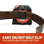 • Easy on/off deep pocket belt clip secures the tape to the pocket or belt when not in use