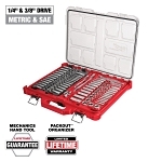 48-22-8436 PACKOUT™ Compact Organizer, 48-22-9004 50 pc 1/4 in Drive Ratchet and Socket Set, 48-22-9008 56 pc 3/8 in Drive Ratchet and Socket Set, 5 mm, 5.5 mm, (2) 6 mm, (2) 7 mm, (2) 8 mm, (2) 9 mm, (2) 10 mm, (2) 11 mm, (2) 12 mm, (2) 13 mm, (2) 14 mm, (2) 15 mm, 16 mm, 17 mm, 18 mm, 19 mm Sockets, 5 mm, 5.5 mm, (2) 6 mm, (2) 7 mm (2) 8 mm, (2) 9 mm, (2) 10 mm, (2) 11 mm, (2) 12 mm, (2) 13 mm, (2) 14 mm, (2) 15 mm, 16 mm, 17 mm, 18 mm, 19 mm Deep Well Sockets, 5/32 in, 3/16 in, 7/32 in, (2) 1/4 in, 9/32 in, (2) 5/16 in, 11/32 in, (2) 3/8 in, (2) 7/16 in, (2) 1/2 in, (2) 9/16 in, 5/8 in, 11/16 in, 3/4 in, 13/16 in, 7/8 in, 15/16 in Sockets, 5/32 in, 3/16 in, 7/32 in, (2) 1/4 in, 9/32 in, (2) 5/16 in, 11/32 in, (2) 3/8 in, (2) 7/16 in, (2) 1/2 in, (2) 9/16 in, 5/8 in, 11/16 in, 3/4 in, 13/16 in, 7/8 in Deep Well Sockets, (2) 3 in and 6 in Extensions, (2) 3/8 in Dr. Extensions, 3/8 in Dr. Universal Joint and (2) 1/4 in Dr. Extensions, 1/4 in Dr. Universal Joint