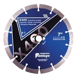 X400 supreme grade diamond blade for asphalt and green concrete. Use wet or dry. Keyhole slot segments. Universal arbor with diamond knockout